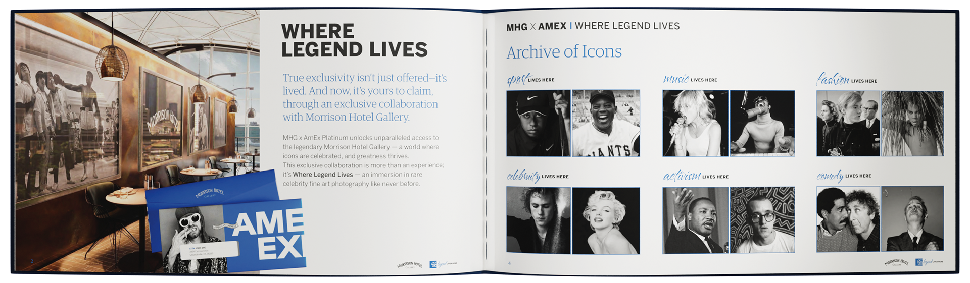 Creating a unique variation on the existing AmEx campaign allowed us to hit as many genres as possible within the MHG photo vaults. Sports, Music, Fashion, Celebrity and even Activism photos act as calls to action for living an extraordinary life. AmEx Platinum Lounges act as both a point of sale and exhibition to VIP members waiting for connecting flights while inflight magazines act as a give away print catalog.