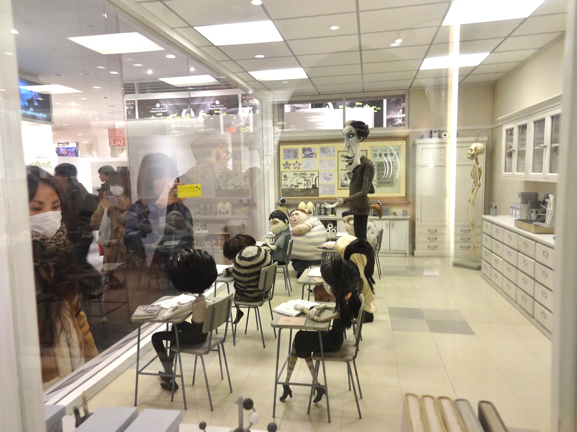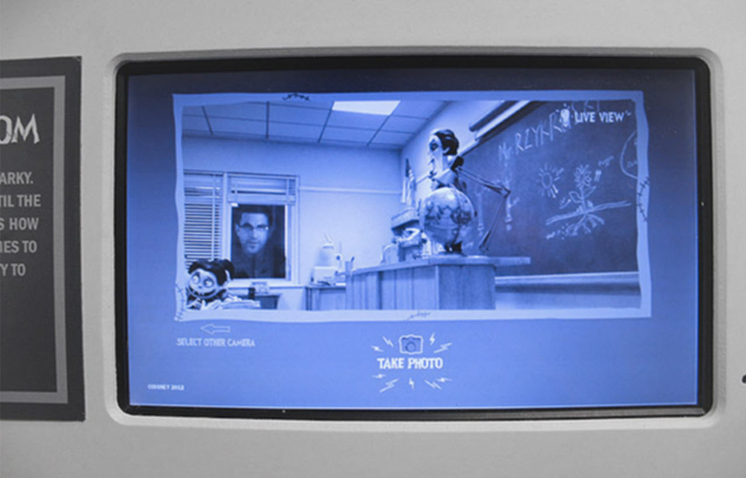 Hidden camera in classroom takes a photo as the viewer peers into the window.