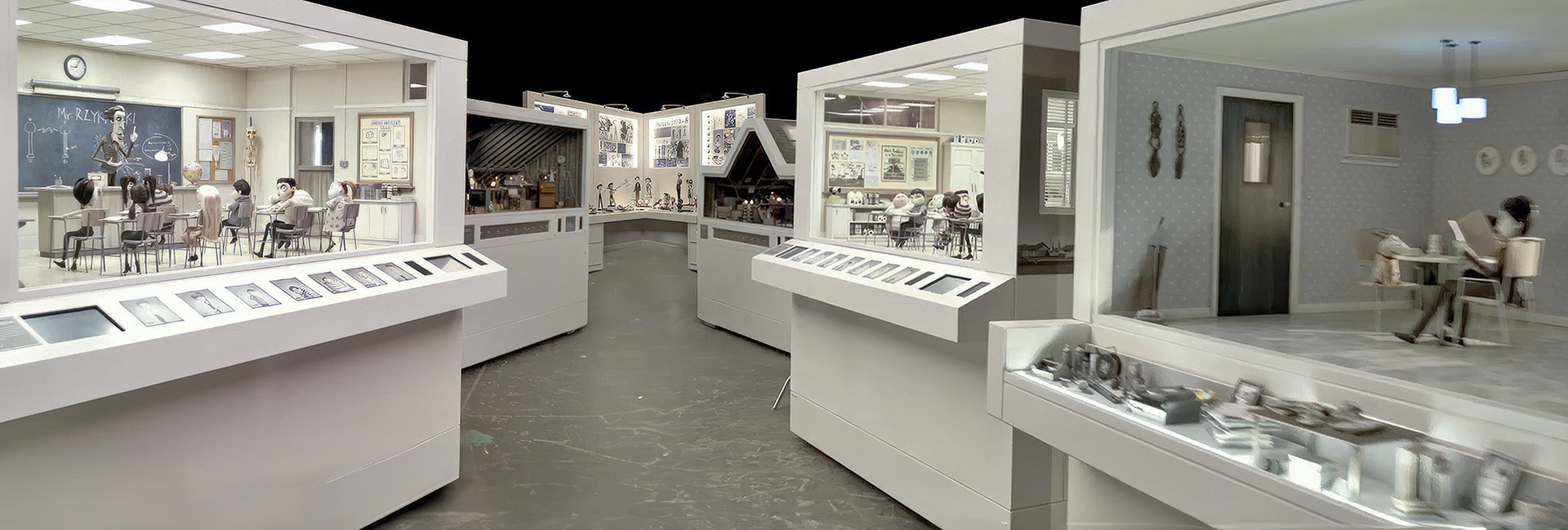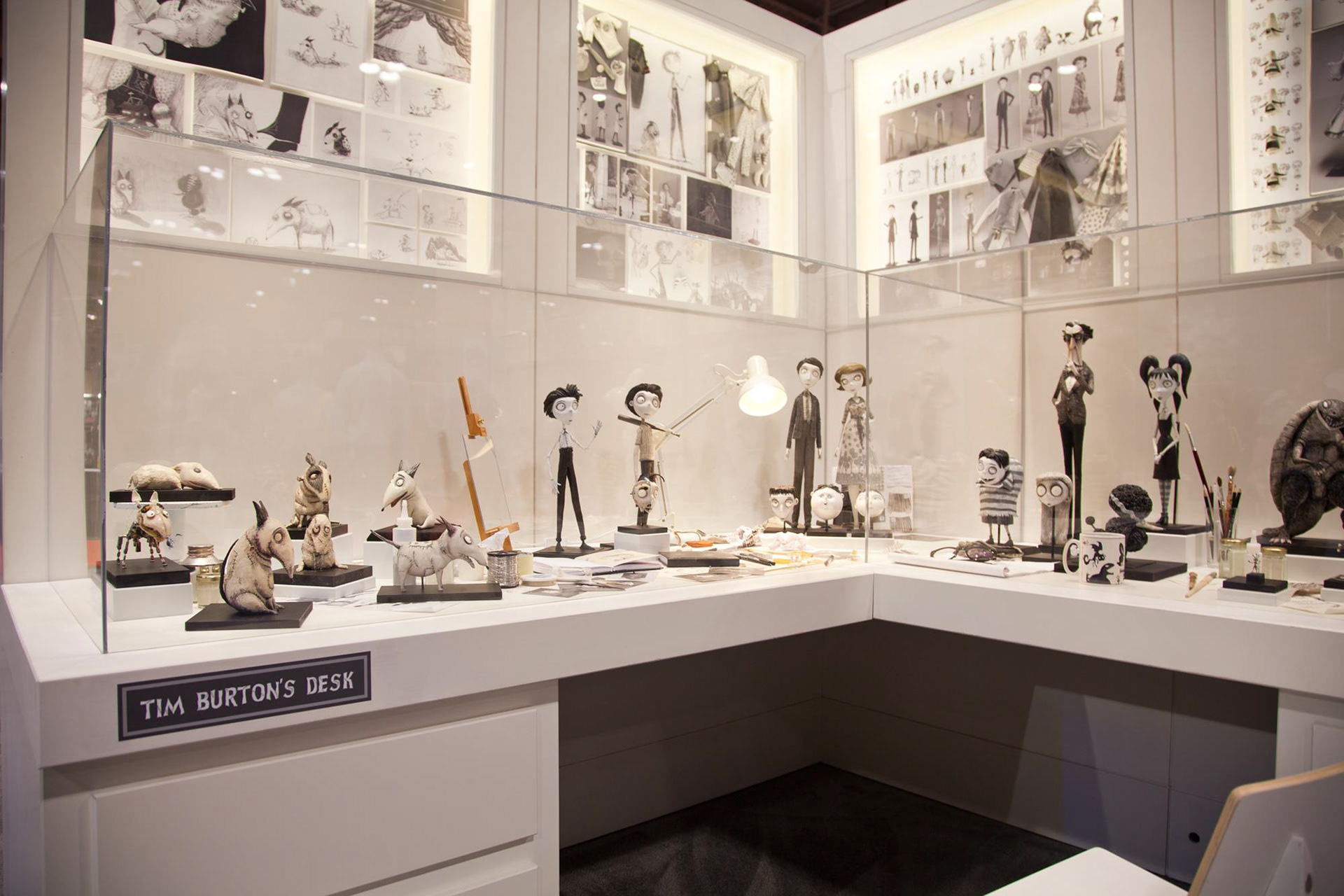 Designed with Tim Burton’s creative process in mind, the exhibition recreated his studio desk—complete with half-constructed models and concept sketches—to capture his raw, conceptual approach. The rest of the exhibit featured reconstructed scenes housed in custom interactive display cases, all modularly designed to fit within a single freight shipping container, ensuring seamless global transport.